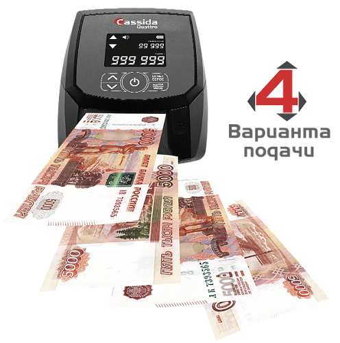 Компактный и надежный детектор Cassida Quattro работает с российскими рублями. Имеет достаточно высокую скорость банкноты и проводит детекцию в режимах: SD: контроль размера банкнот, UV: контроль в УФ диапазоне, MG: магнитная детекция, IR: контроль ИК защиты, DD: контроль оптической плотности. Работает от сети или аккумулятора, который является опциональным решением.