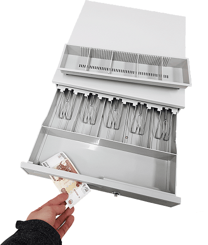 На передней панели имеется щель для внесения крупных купюр в секретный отсек. Огромный денежный ящик CD-405-W подойдет для любого магазина и даже гипермаркета.