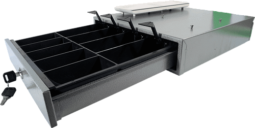 Электромеханический денежный ящик АМС 100Ф можно подключить к кассовому аппарату через порт RS-232. Имеется 4 секции с зажимами для купюр и 5 для монет.