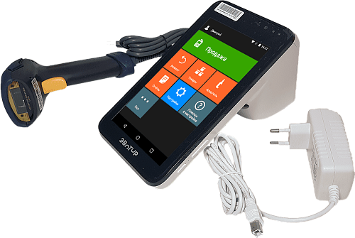 Стационарный, но со встроенным аккумулятором, кассовый аппарат на основе планшета на Андроиде со встроенным сканером 1D и передачей данных онлайн под ФЗ-54.