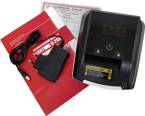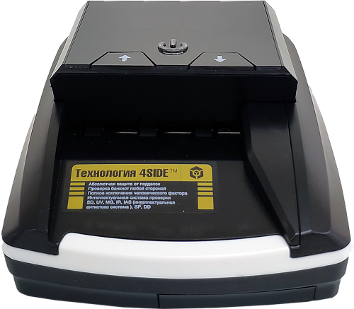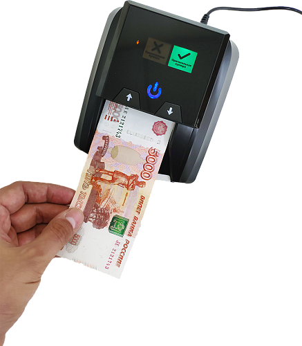 Автоматический детектор банкнот с бюджетным упрощенным дисплеем. Детектор работает только с рублями. Время анализа купюры составляет 0,5 секунды. Возможность самостоятельно обновлять программное обеспечение через подключение к компьютеру по USB.
