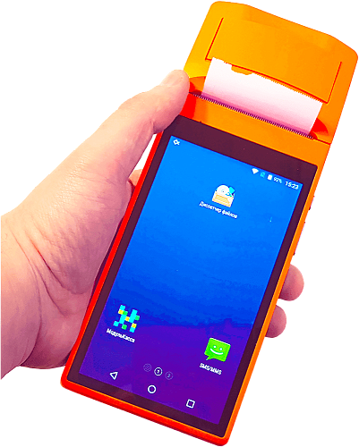 Мобильная (переносная) онлайн-касса под ФЗ-54 на основе планшета под управлением Android со встроенным сканером 1D и 2D штрих-кодов.